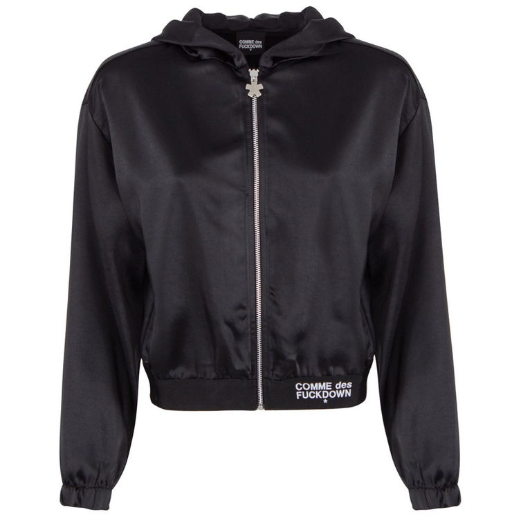 Embrace audacious luxury with the Comme Des Fuckdown satin jacket – a statement in street chic. Equally at home on city streets or at upscale lounges, this hooded masterpiece showcases the boldness expected from Comme Des Fuckdown. Featuring a sleek zipper closure, logoed elastic hem for an edgy aesthetic, and two handy side pockets, it’s the perfect blend of fashion-forward design and functional elegance. Define your wardrobe with this fearless black polyester piece, crafted with an undeniable edge.