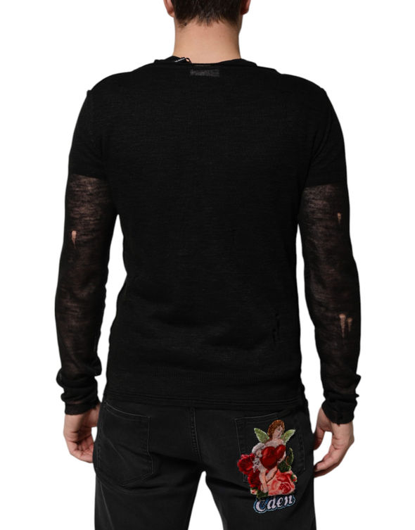 Dolce & Gabbana Black Linen Mesh Tattered Longsleeves T-shirt