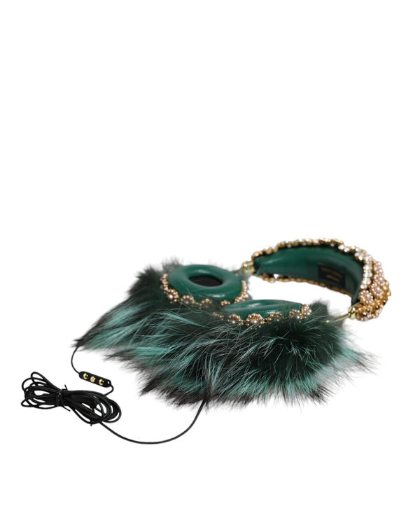 Dolce & Gabbana Green Gold Crystal Fur Headset Audio AUX Headphones
