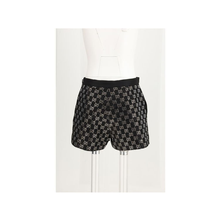 The tweed wool lamé embroidered Shorts by Gucci reinterpret the House’s iconic codes with a luminous, contemporary elegance. Crafted from lightweight black wool lamé tweed, they are enhanced by an all-over GG crystal embroidery that brings a sparkling accent suitable for both day and evening looks. The design is fully lined for comfort and structure, and finished with two side pockets that add a refined yet functional touch.