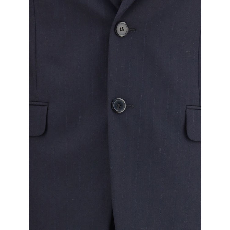 The single-breasted wool and cashmere Suit by Prada exemplifies refined tailoring and timeless sophistication. Crafted from a luxurious blend of wool and cashmere, it features a slim fit and meticulous attention to detail. The jacket comes with a classic notch lapel, two-button closure, flap welt pockets, and four-button cuffs, while a central back vent and full lining enhance its structure. The slim trousers are finished with slanted front pockets and welt back pockets, offering a perfect balance between classic craftsmanship and modern elegance.