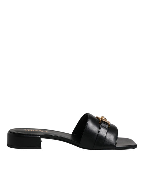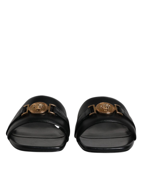 Versace Black Leather Logo Plaque Slip On Slides Flats Shoes